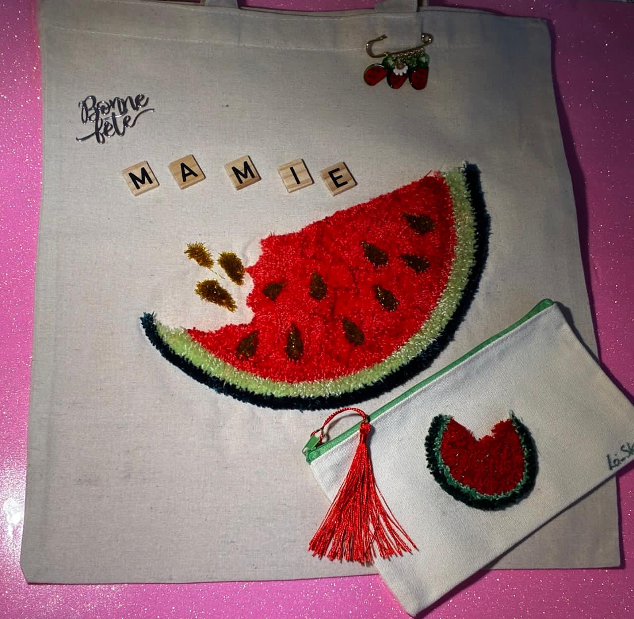 CREATION ARTISANALE PUNCH NEEDLE BRODERIE SAC TOTE BAG+ TROUSSE UN CADEAU UTILE DE TOUS LES JOURS